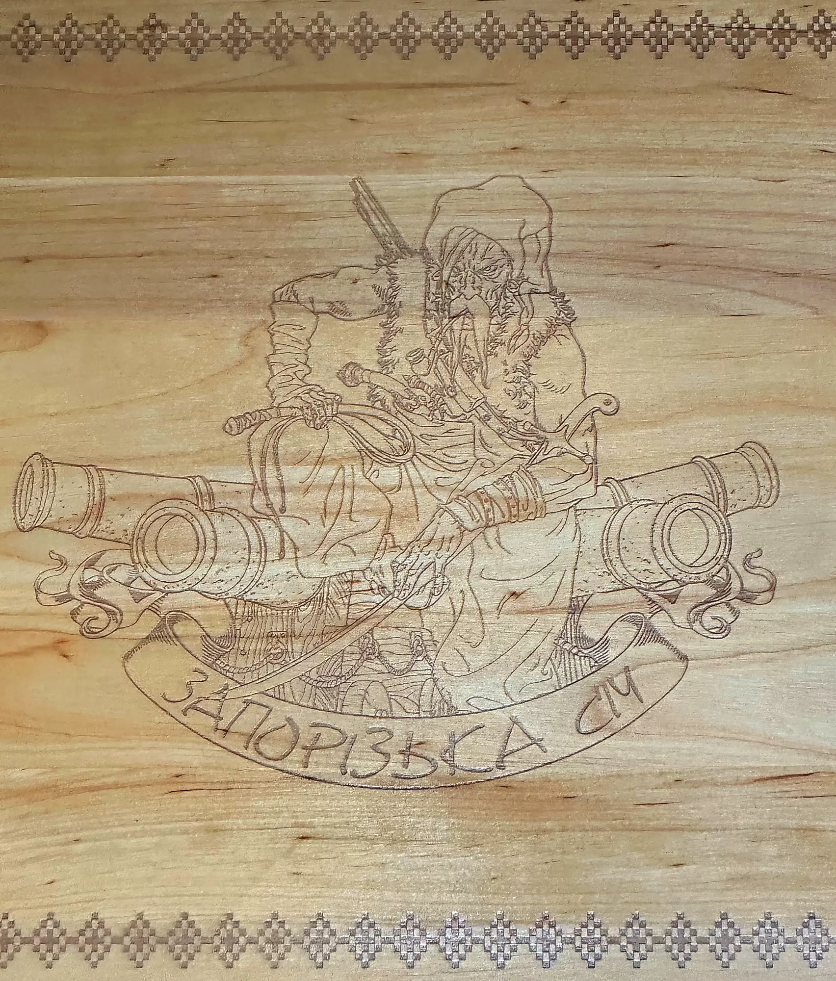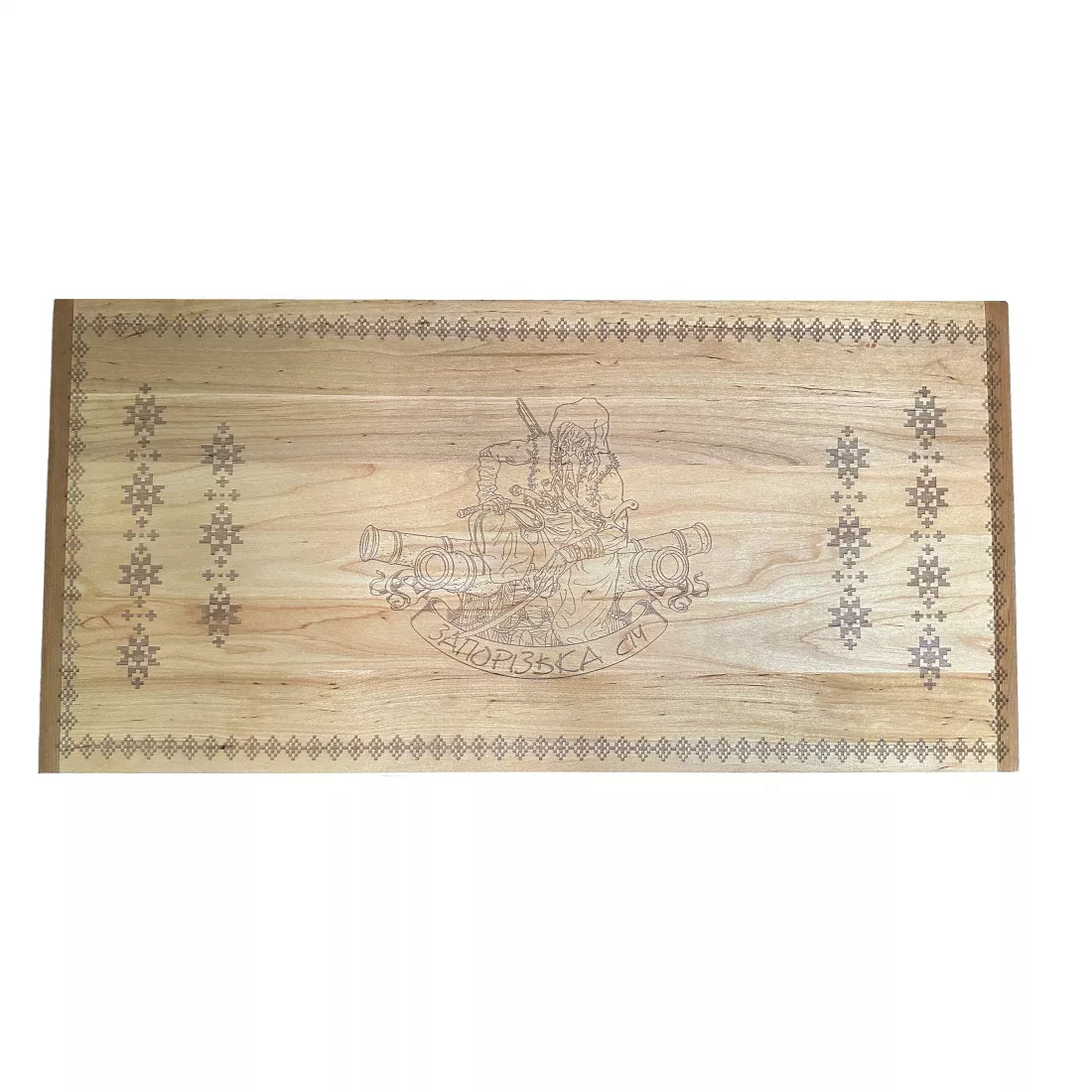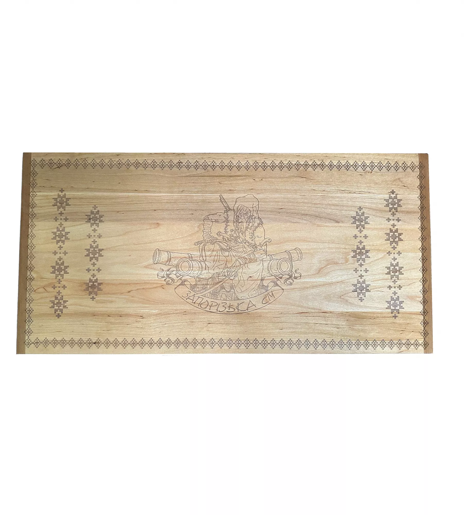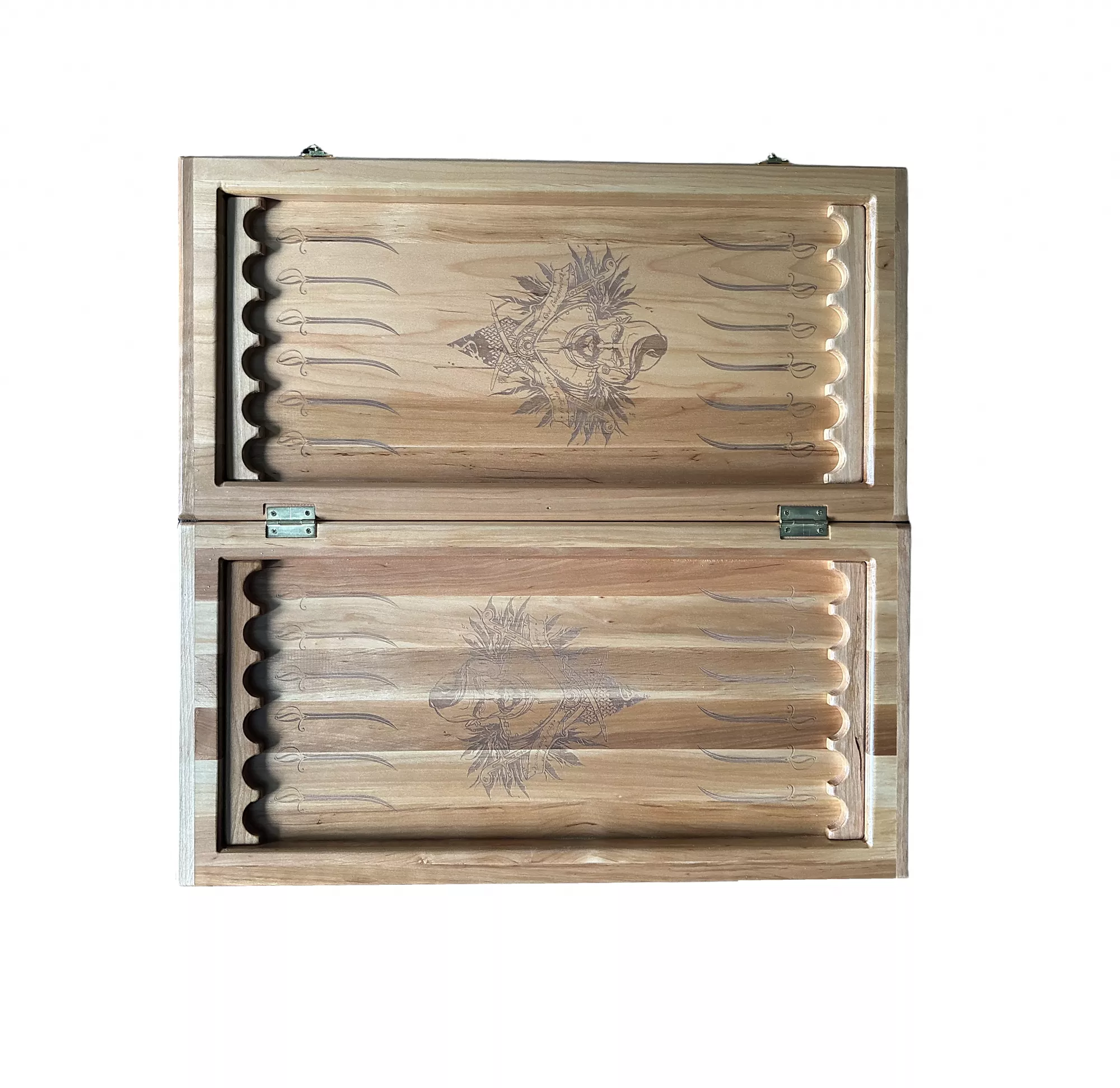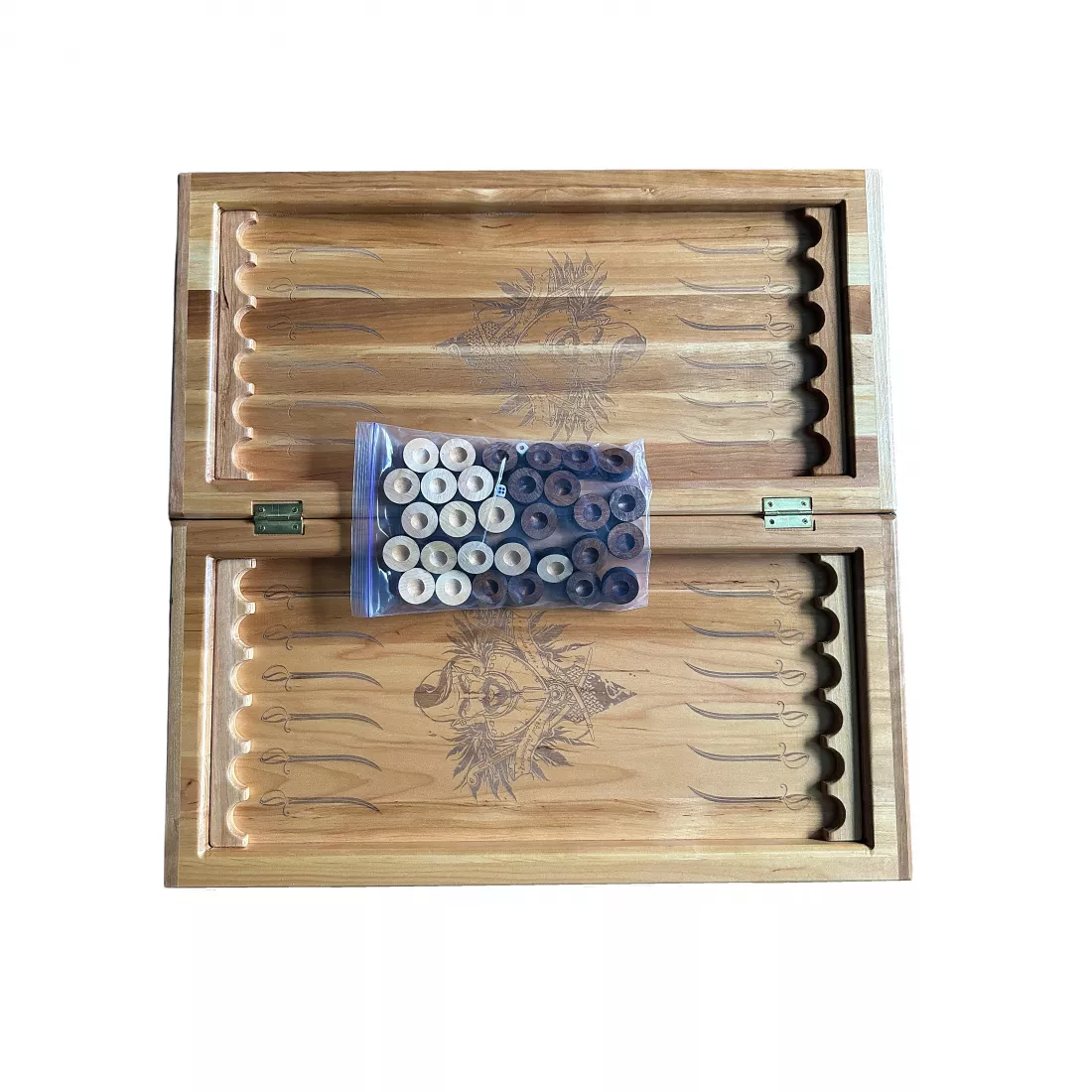 Нарди "Запорізька січ" у розкритому вигляді розмір 57х56х2,6 см виконані із цілісного масиву дерева, є осередки для закладу фішок, малюнок нанесений за допомогою лазерного гравіювання. Фішки дерев'яні, із виїмкою під палець, гральні кубики. Упаковка - картонна коробка.
