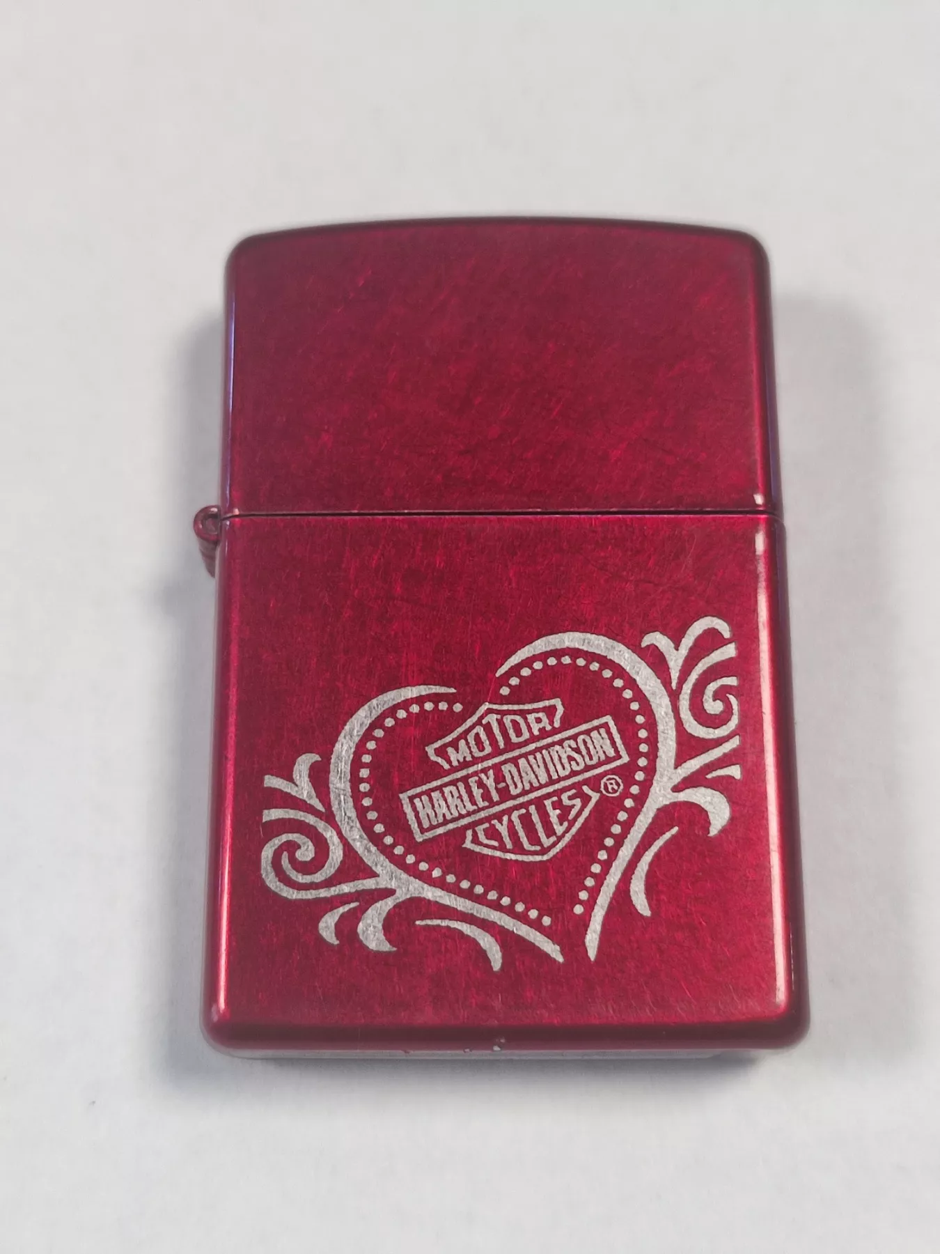 Корпус латунний від запальничкі ZIPPO ZIPPO HARLEY DAVIDSON HEART CANDY APPLE RED, давно знятої з виробництва, дуже рідкий коллекційний екземпляр, оригінал, 2005 року випуску. Корпус повністю новий, не був у використанні, але має деякі потертості та мікроподряпинки покриття, виставковий екземпляр. Продається без серцевинки, можна придбати газові інсерти - один чи два турбо, газовий кремнієвий чи USB.